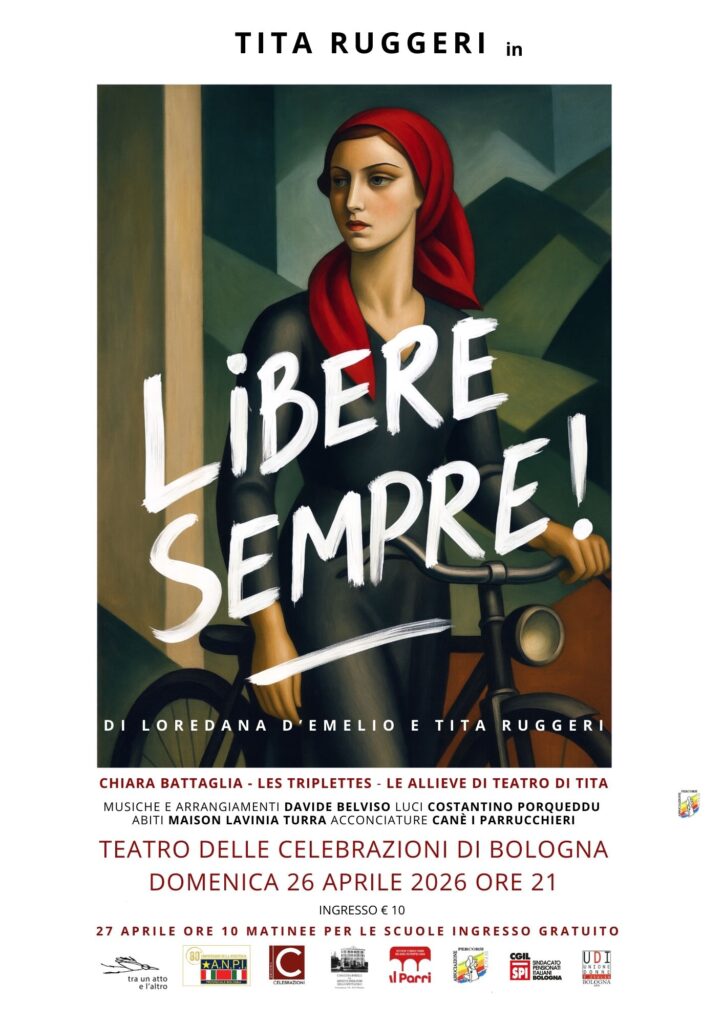 Vi aspettiamo domenica 26 aprile, alle ore 21, presso il Teatro delle celebrazioni di Bologna per lo spettacolo “Libere sempre!” di Loredana d’Emelio e Tita Ruggeri.