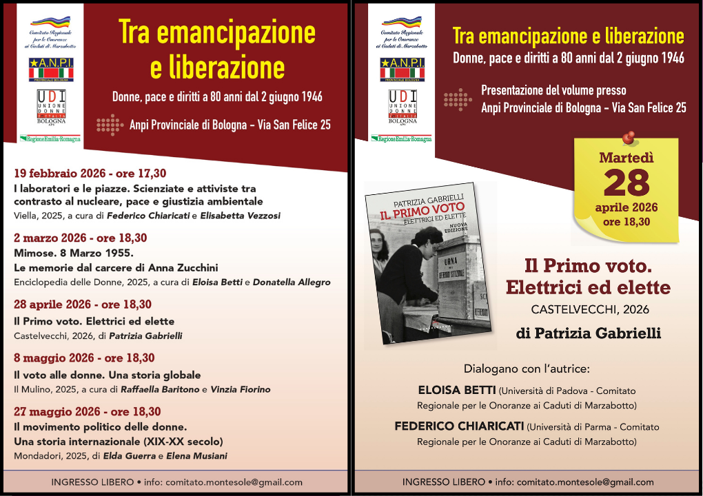 Vi aspettiamo martedì 28 aprile, alle ore 18.30, presso l’Anpi Provinciale di Bologna (Via San Felice 25) per la presentazione del volume “Il primo voto. Elettrici ed elette” di Patrizia Gabrielli. Dialogano con l’autrice Eloisa Betti (Università di Padova – Comitato Regionale per le Onoranze ai Caduti di Marzabotto) e Federico Chiaricati (Università di Parma – Comitato Regionale per le Onoranze ai Caduti di Marzabotto).