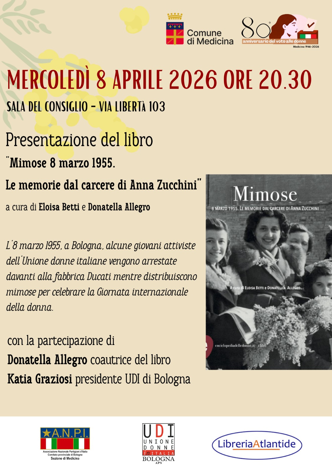 Vi aspettiamo mercoledì 8 aprile, alle ore 20.30, presso la Sala del Consiglio del Comune di Medicina (Via Libertà 103) per la presentazione del libro “Mimose 8 marzo 1955. Le memorie dal carcere di Anna Zucchini” a cura di Eloisa Betti e Donatella Allegro.