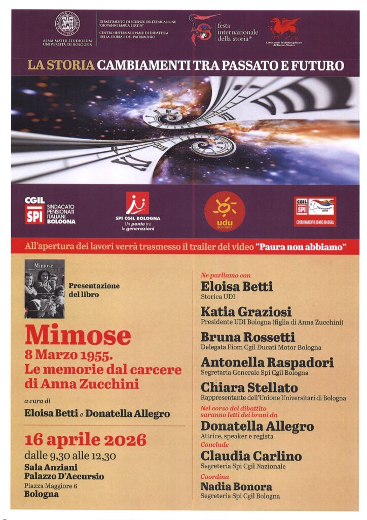 Vi aspettiamo giovedì 16 aprile, alle ore 9.30, presso la Sala Anziani di Palazzo D’Accursio a Bologna per la presentazione del libro “Mimose 8 marzo 1955. Le memorie dal carcere di Anna Zucchini” a cura di Eloisa Betti e Donatella Allegro.