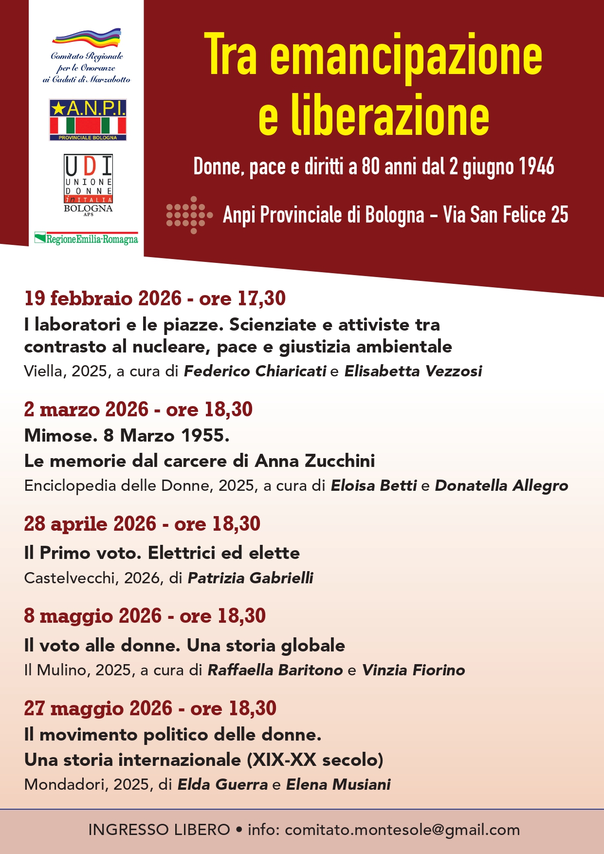 Udi Bologna, insieme con il Comitato Regionale per le Onoranze ai Caduti di Marzabotto e l’Anpi Provinciale di Bologna, organizza un ciclo di 5 incontri sul tema “Tra emancipazione e liberazione. Donne, pace e diritti a 80 anni dal 2 giugno 1946”.