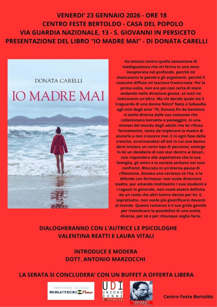 Vi aspettiamo venerdì 23 gennaio, alle ore 18, presso il Centro Feste Bertoldo di San Giovanni in Persiceto (Via Guardia Nazionale 13) per la presentazione del libro “Io madre mai” di Donata Carelli.
