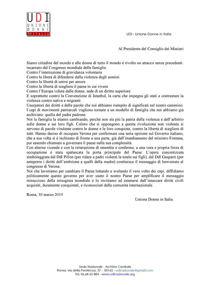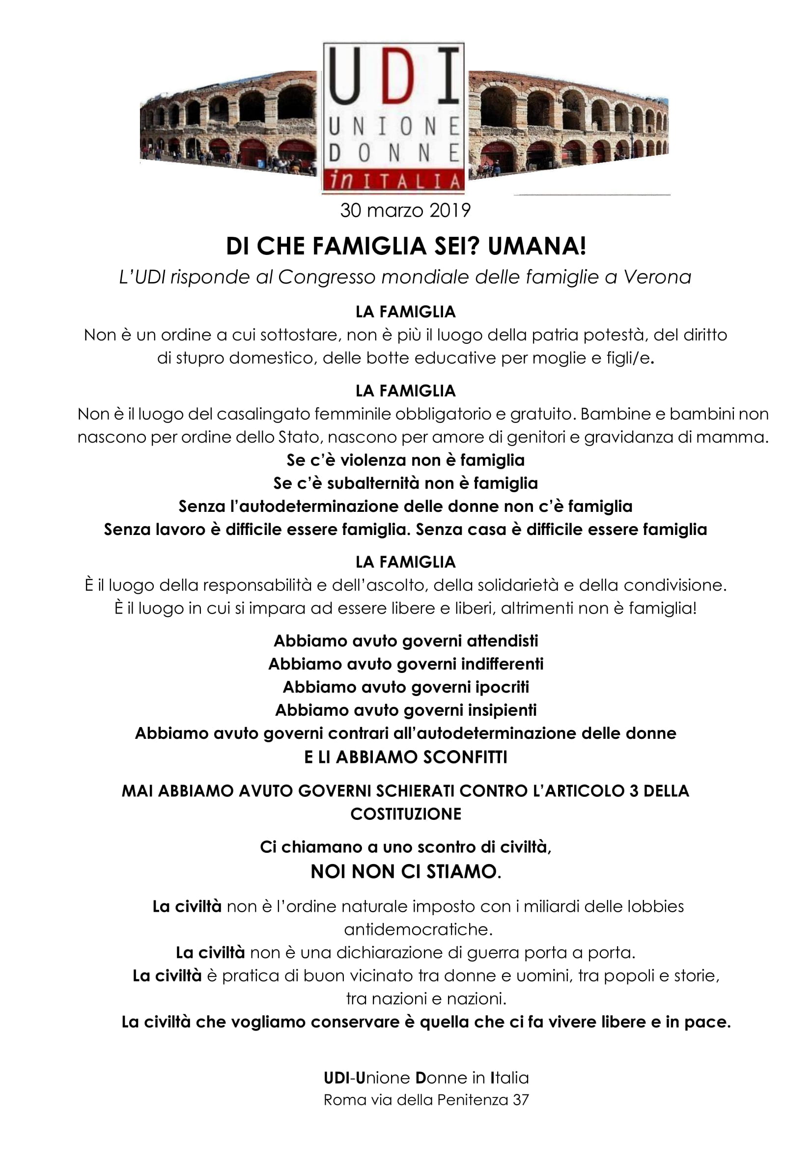 L’opera concretizzata simboleggiata dal Ddl Pillon (per ridare a padri violenti la tutela sui figli), dal Ddl Gasparri (peranteporre i diritti dell’embrione a quelli della madre) costituisce il messaggio di benvenuto alcongresso di Verona. Noi che lavoriamo per cambiare il Paese lottando e svelando il vero volto dei capi, diffidiamo politicamente questo governo per aver usato il nostro Paese per amplificare il messaggio minaccioso della misoginia mondiale e lo invitiamo ad astenersi dall’intaccare diritti civili acquisiti, duramente conquistati, e riconosciuti dalla comunità internazionale.