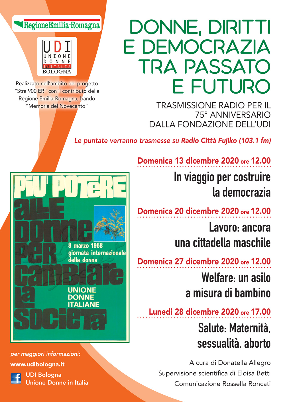 Programma a cura di Donatella Allegro, supervisione storica Eloisa Betti, comunicazione Rossella Roncati.Realizzato in occasione del 75ยฐ anniversario dellโUDI nellโambito del progetto โStra 900 ERโ con il contributo della Regione Emilia-Romagna, bando โMemoria del Novecentoโ.