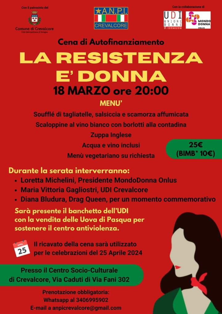 La Resistenza è Donna! Vi aspettiamo lunedì 18 marzo, alle ore 20, presso il Centro socio-culturale di Crevalcore (via Caduti di via Fani 302).