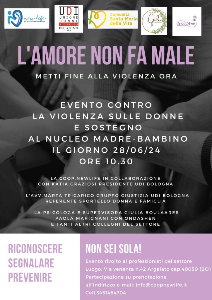 L’amore non fa male – 28 giugno News By Redazione 4 30 Maggio 2024 Tags: eventi, gruppo giustizia, udibologna No Comments Evento contro la violenza sulle Donne e sostegno al nucleo madre-bambino, rivolto ai professionisti del settore.Partecipazione su prenotazione: info@coopnewlife.it / 3451464704 Share:
