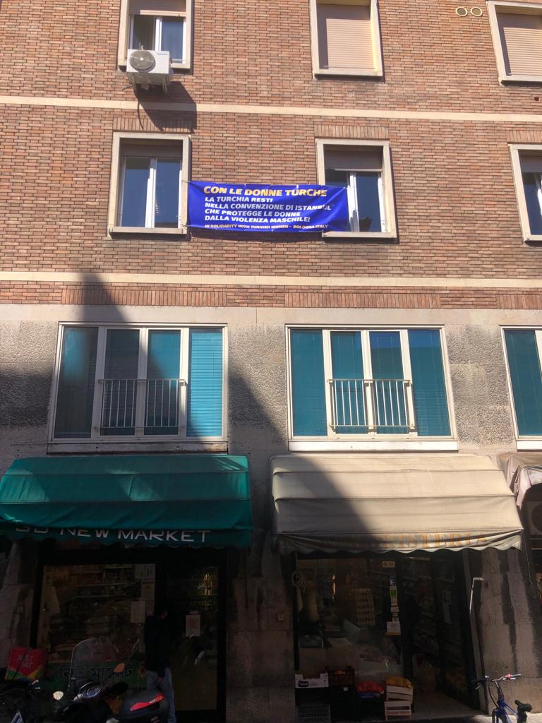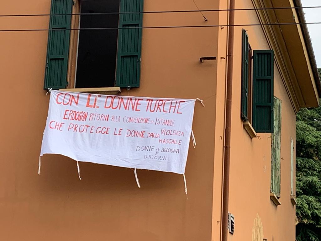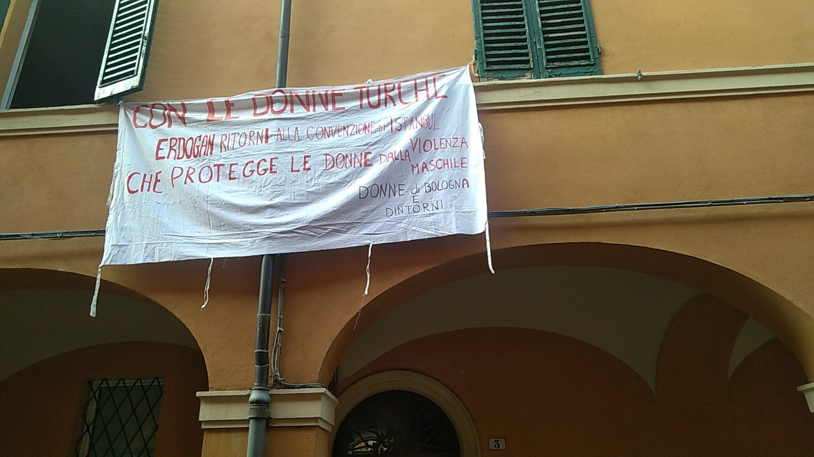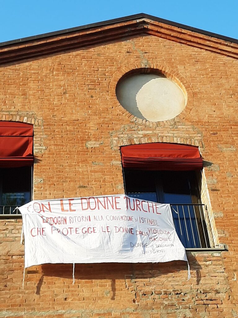 Anche a Bologna, pur se obbligate nelle nostre case per il Covid, non possiamo esimerci dall’esprimere con le nostre modalità, tutta la nostra solidarietà alle donne Turche e lo facciamo con le nostre parole e con un lenzuolo-striscione che abbiamo cucito e scritto a mano e in gruppo che vedrete nella foto allegata. È il nostro striscione itinerante da donna a donna, da balcone a balcone affinché ne nascano altri, un tam tam che non si ferma e che durerà dei giorni, perché noi donne siamo tenaci e non ci arrendiamo di fronte ad un mondo patriarcale che ci vuole sottomesse e perché arrivi forte, la nostra vicinanza e solidarietà alle sorelle turche in lotta.