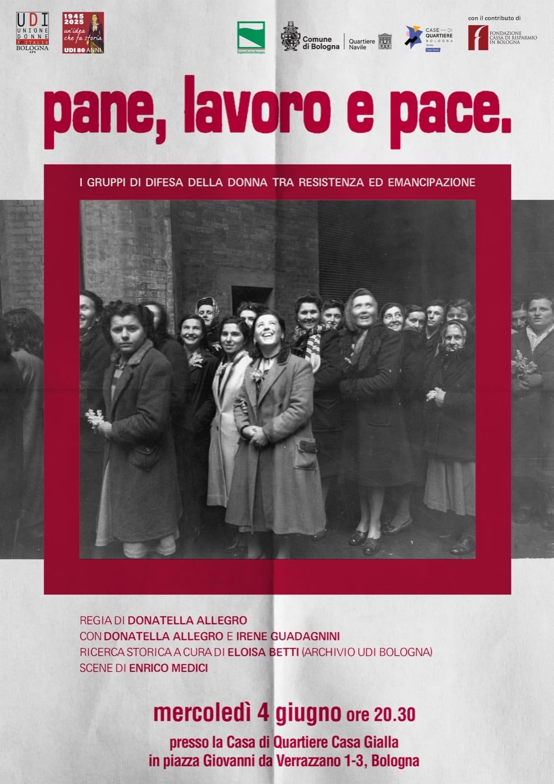 Vi aspettiamo mercoledì 4 giugno, alle ore 20.30, presso la Casa di Quartiere Casa Gialla (piazza Giovanni da Verrazzano 1-3, Bologna) per lo spettacolo “Pane, lavoro e pace”.