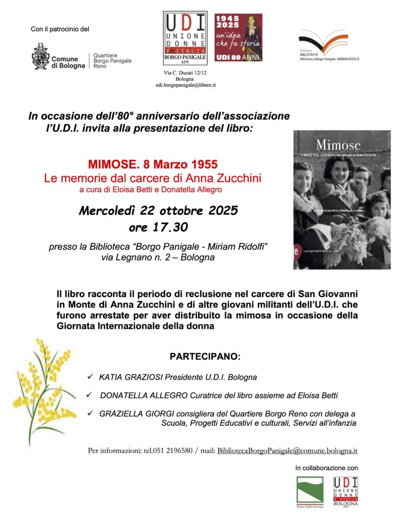 Vi aspettiamo mercoledì 22 ottobre, alle ore 17.30, presso la Biblioteca Borgo Panigale – Miriam Ridolfi, per la presentazione del libro “Mimose: 8 marzo 1955. Le memorie dal carcere di Anna Zucchini”, a cura di Eloisa Betti e Donatella Allegro.
