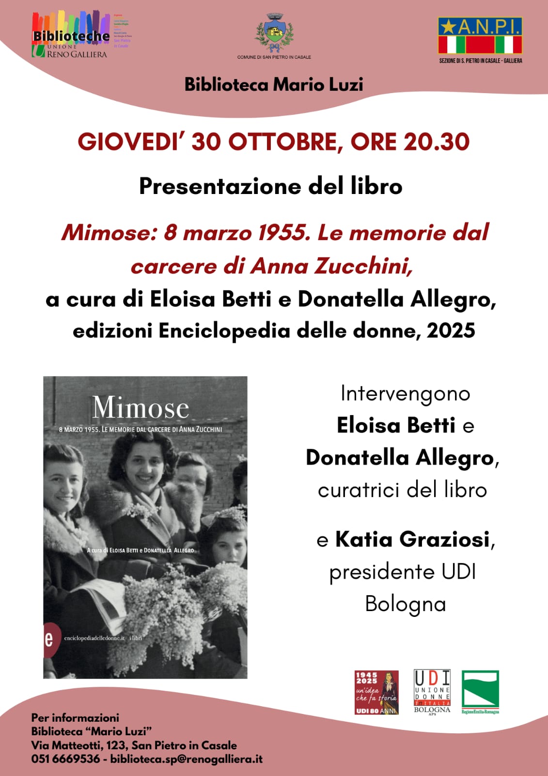 Vi aspettiamo giovedì 30 ottobre, alle ore 20.30, preso la Biblioteca Mario Luzi di San Pietro in Casale, per la presentazione del libro “Mimose: 8 marzo 1955. Le memorie dal carcere di Anna Zucchini” a cura di Eloisa Betti e Donatella Allegro. Dialoga con le curatrici Katia Graziosi (presidente Udi Bologna).