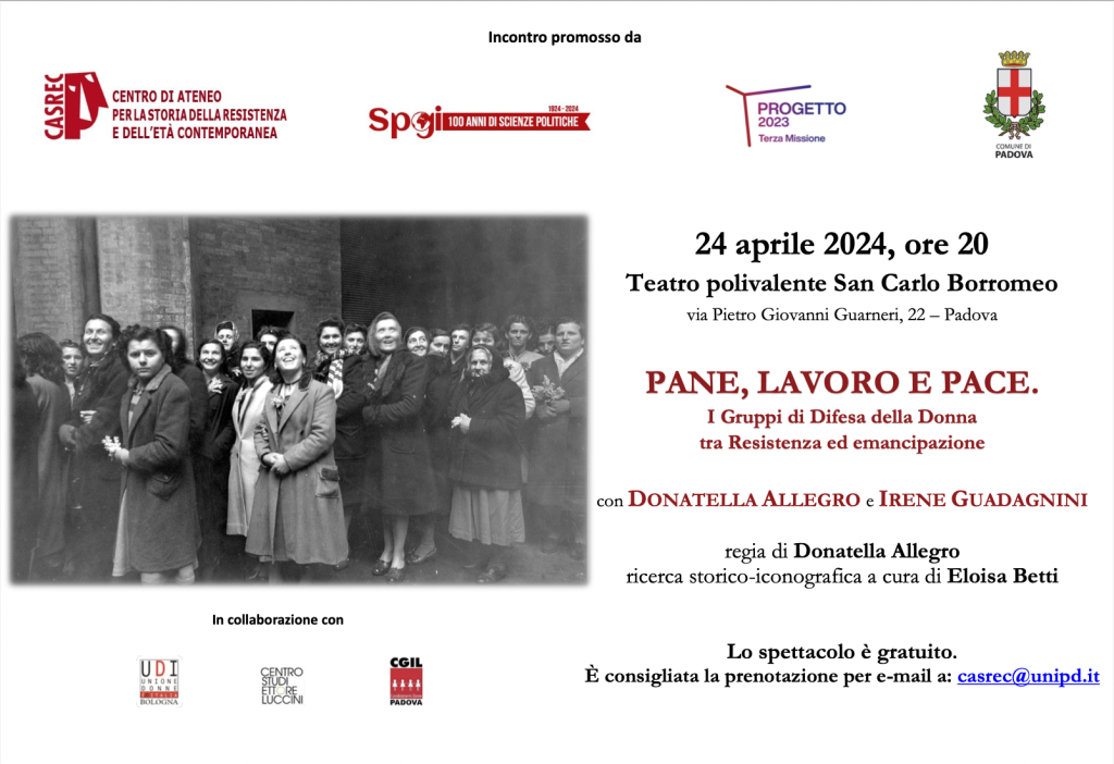 Vi aspettiamo mercoledì 24 aprile, alle ore 20, presso il Teatro polivalente San Carlo Borromeo di Padova (via Pietro Giovanni Guarneri 22) per lo spettacolo “Pane, lavoro e pace. I Gruppi di Difesa della Donna tra Resistenza ed emancipazione”.
