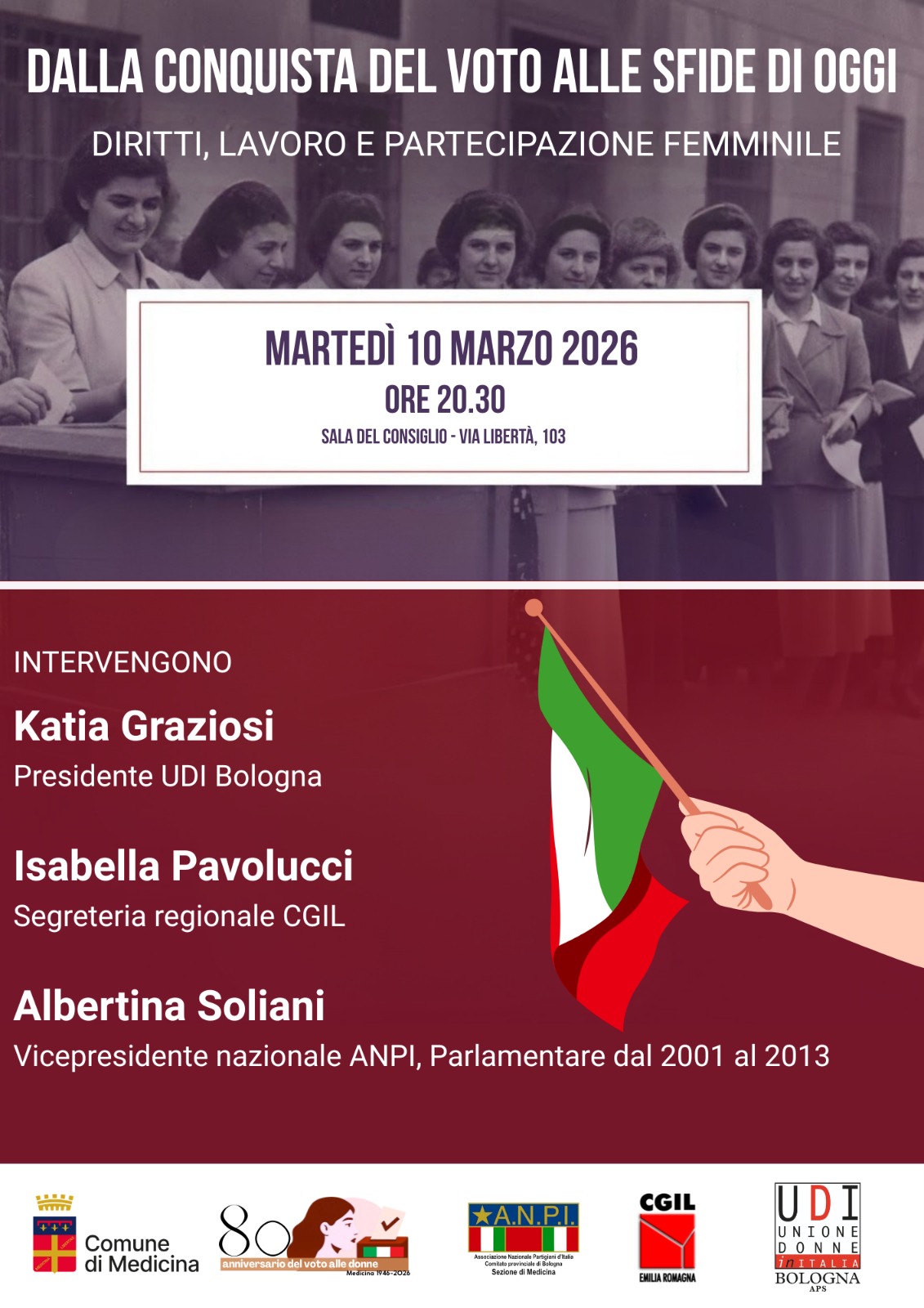 Vi aspettiamo martedì 10 marzo, alle ore 20.30, presso la Sala del Consiglio di Medicina (Via Libertà 103) per discutere insieme di diritti, lavoro e partecipazione femminile negli ultimi 80 anni.