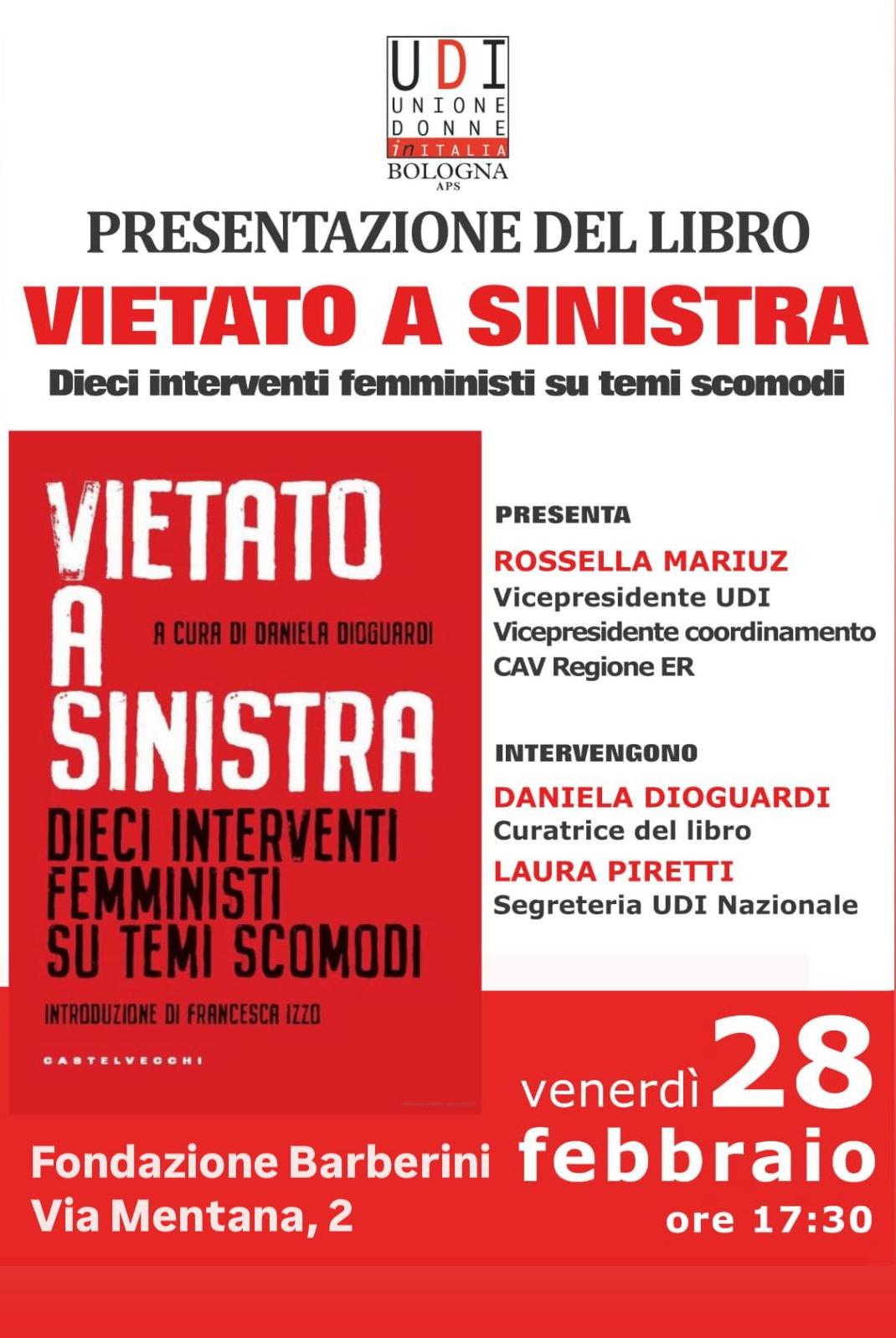 Vi aspettiamo venerdì 28 febbraio, alle ore 17.30, presso la Fondazione Barberini (via Mentana 2, Bologna) per la presentazione del libro “Vietato a sinistra. Dieci interventi femministi su temi scomodi” a cura di Daniela Dioguardi.
