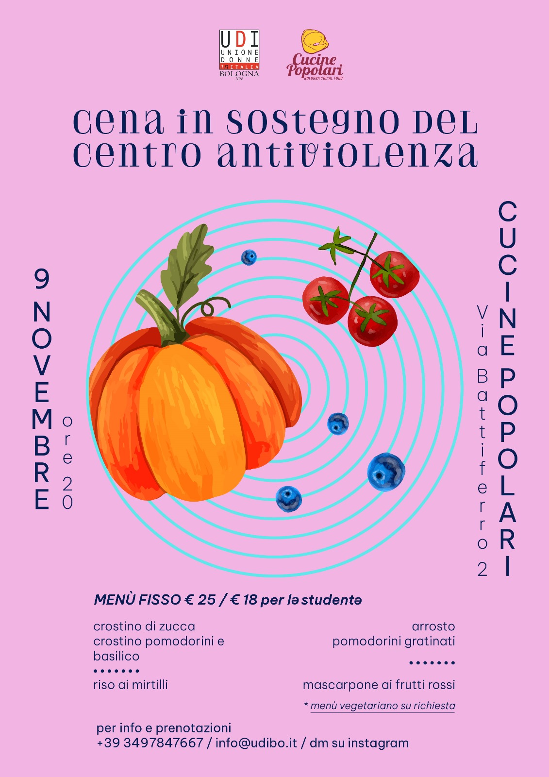 Vi aspettiamo sabato 9 novembre, alle ore 20, presso le Cucine Popolari (via Battiferro 2, Bologna) per la cena a sostegno del Centro Antiviolenza Udi.