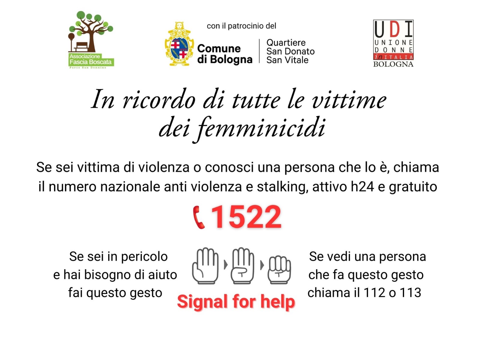 Il corso si svolge presso i Centri Antiviolenza CHIAMA chiAMA di MondoDonna e UDI Bologna. Al termine del corso sarà rilasciato un attestato di frequenza che permette di lavorare presso i Cav e le Case rifugio del territorio nazionale.