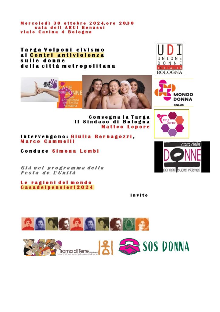 Siamo liete di invitarvi alla cerimonia di conferimento della Targa Volponi civismo al nostro Centro Antiviolenza che avrà luogo il giorno 30 ottobre, alle ore 20:30, presso la sala dell’ARCI Benassi a Bologna.