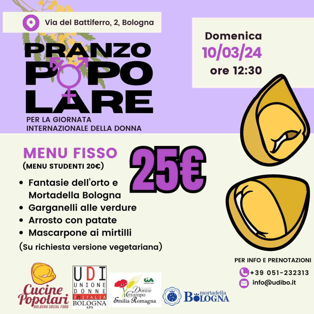In occasione della Giornata Internazionale della Donna, vi aspettiamo il 10 marzo 2024, alle ore 12.30, presso le Cucine Popolari (via del Battiferro 2) per il Pranzo Popolare.