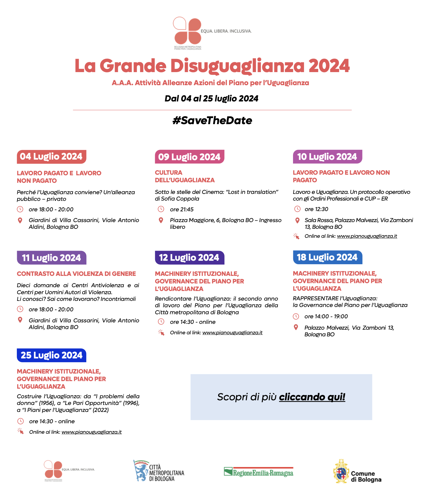 Vi aspettiamo l’11 luglio, alle ore 18, presso i Giardini di Villa Cassarini – P.le Marcella Di Folco (Viale Antonio Aldini, Bologna).