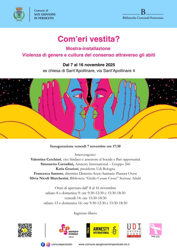 Vi aspettiamo venerdì 7 novembre, alle ore 17.30, presso la ex chiesa di Sant’Apollinare di San Giovanni in Persiceto per l’inaugurazione della mostra-installazione “Com’eri vestita?”. Intervengono: Valentina Cerchiari, Simonetta Corradini, Katia Graziosi, Francesca Santoro e Silvia Nicoli Marchesini.