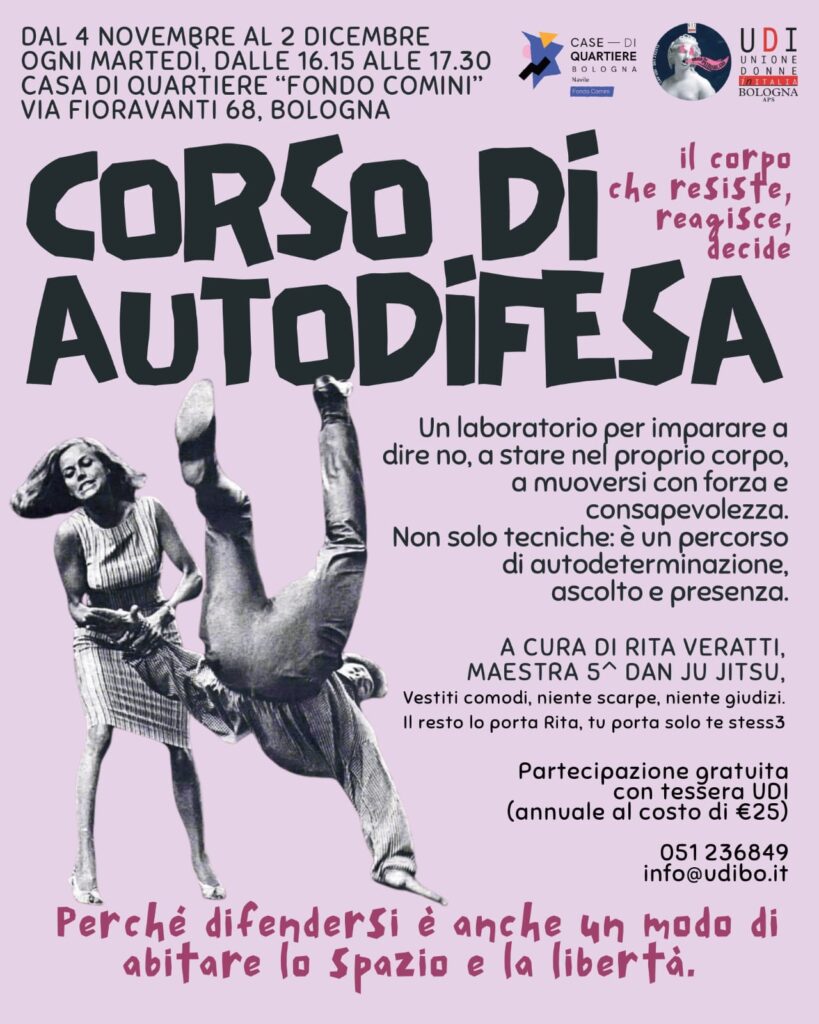 Vi aspettiamo dal 4 novembre, ogni martedì fino al 2 dicembre, alle ore 16.15 presso la Casa di Quartiere “Fondo Comini” (Via Fioravanti 68, Bologna) per il corso di autodifesa. Un laboratorio per imparare a dire di no, a stare nel proprio corpo, a muoversi con forza e consapevolezza. Il corso è a cura di Rita Veratti (maestra 5° dan ju jitsu).