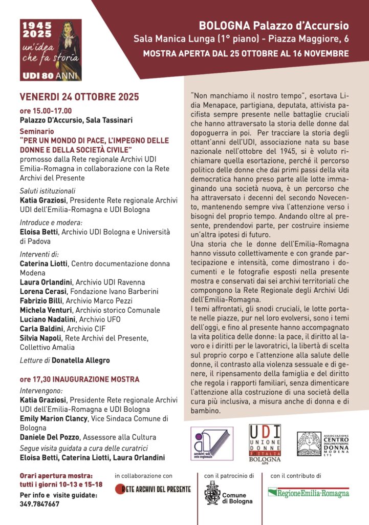 Vi aspettiamo venerdì 24 ottobre, alle ore 15, presso la Sala Tassinari di Palazzo D’Accursio a Bologna, per il seminario “Per un mondo di pace. L’impegno delle donne e della società civile“, promosso dalla Rete regionale Archivi Udi Emilia-Romagna in collaborazione con la Rete Archivi del Presente.