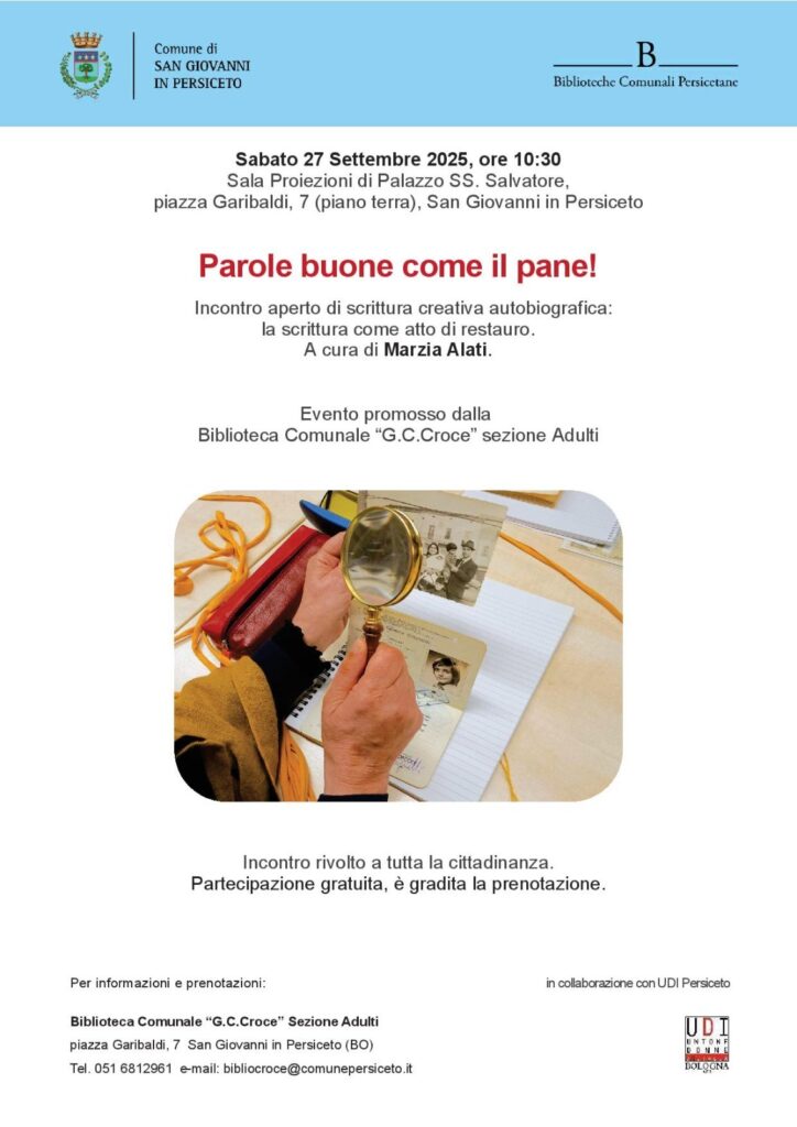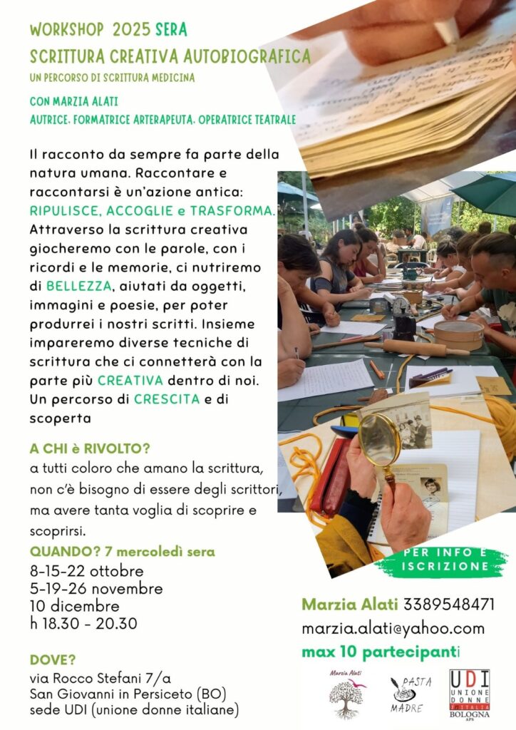 Vi aspettiamo a partire dall’8 ottobre presso la sede Udi di San Giovanni in Persiceto (via Rocco Stefani 7/a) per il workshop di scrittura creativa autobiografica tenuto da Marzia Alati (autrice, formatrice arterapeuta e operatrice teatrale).