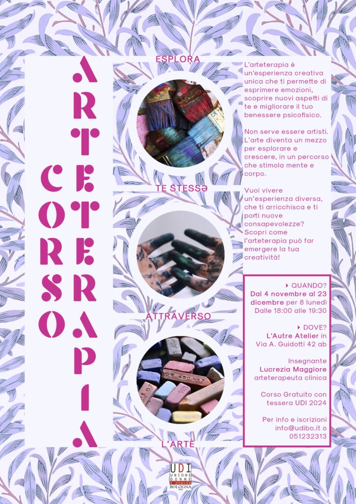 Vi aspettiamo dal 4 novembre (per 8 lunedì), dalle ore 18 alle 19.30, presso L’Autre Atelier (Via Guidotti 42 ab, Bologna) per il nuovo corso di Arte-Terapia!
