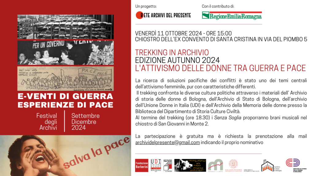 Il trekking prenderà il via dall’Archivio di storia delle donne il giorno 11 ottobre alle ore 15. Proseguirà presso l’Archivio di Stato, visitare l’Archivio Unione Donne in Italia (UDI) e, infine, terminare presso la Biblioteca del Dipartimento di Storia Culture Civiltà, dove verranno presentate testimonianze dall’Archivio Maria Bassi conservato all’interno del Fondo della Memoria delle Donne.